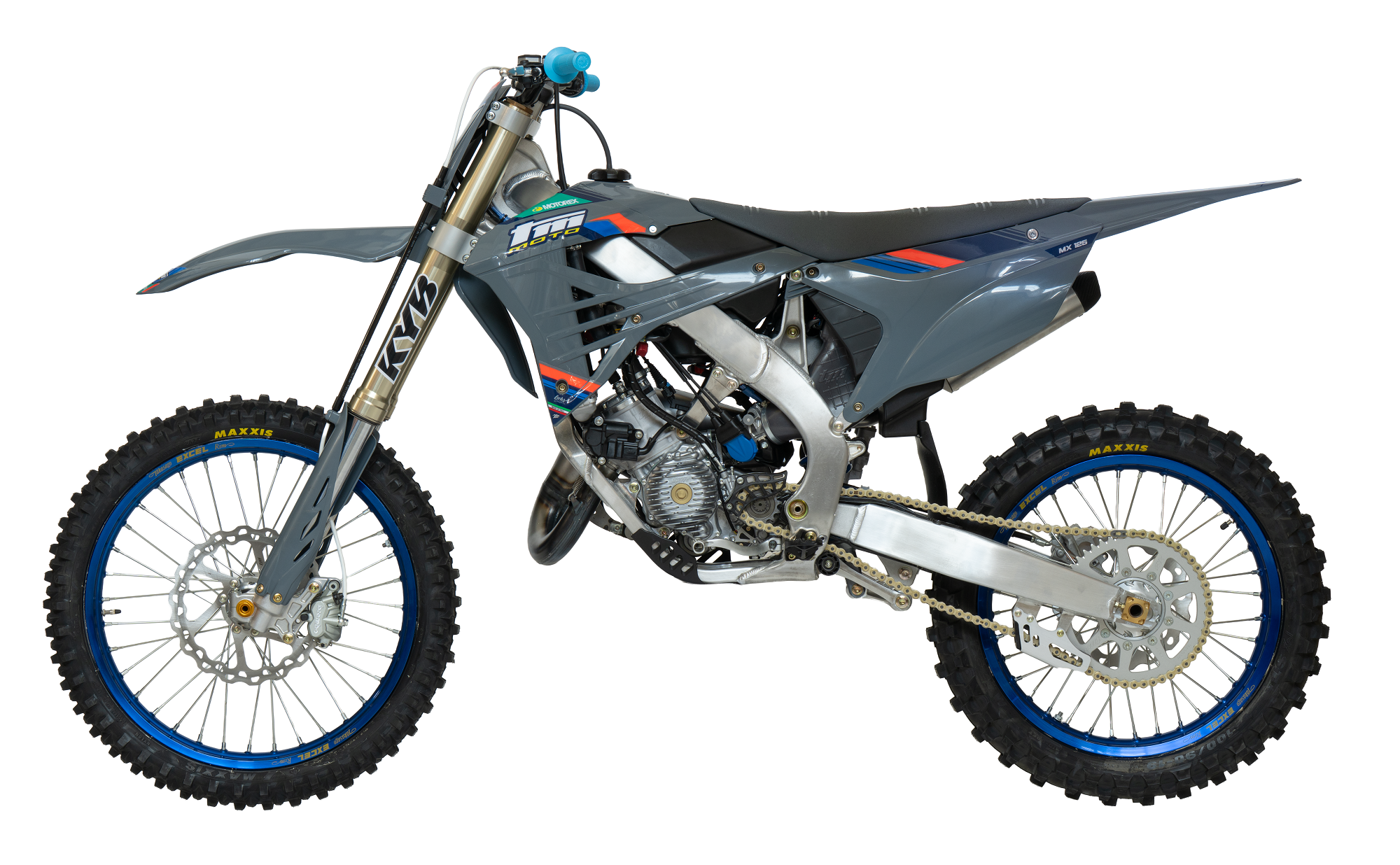 The high-end specification of all TM Racing machines is well-versed and this model year is no exception. The specification list for a ‘production machine’ is vast and features numerous high-quality components throughout. We have have several small changes and revisions to further enhance the chassis that was already designed to improve handling, weight balance, overall machine weight (reduced), rider ergonomics and the visual look. All variants chassis’ and sub-frames will once again be constructed using aluminium, with each engine ‘capacity’ / variant having a chassis unique to that engine displacement. This ‘tailoring’ of the chassis to engine allows TM Racing to design and build each machine for minimal weight, compactness, and better handling characteristics with mass centralisation specific to each model whether 2-stroke or 4-stroke. All chassis are constructed using the latest design elements that reduce overall chassis weight whilst maintaining maximum strength, matched to new revisions in chassis geometry / triple clamp angles that are specifically tailored to each model once again, allowing the best in handling characteristics for each model in the range. On all models, the now standard fitment KYB 48mm twin chamber fork, will continue to adopt the latest generation of internal friction reduction ‘coatings’ with some new internal settings to create a ‘softer’ feel for greater rider comfort and shock absorbtion. These latest generation forks are designed to give improved response for faster changes to the terrain, all still controlled by the more favourable spring and oil set-up which is still proving to give greater reliability and more consistent performance. The TM Racing shock absorber, made in house by the TM racing technicians, has seen some large internal changes over the last 2 years and will still adopt this latest ‘seal’ system designed to reduce friction and increase shock performance, also featuringwill be a brace of internal changes to increase smoothness, comfort and aid tracion. Combined with the latest swing-arms, revised linkage components and spindle diameters to limit and ‘control’ flex, the shock allows for a more progressive feel, giving improved track stability and maximising traction. The chassis and suspension components work together to achieve incredible handling characteristics on a multitude of surfaces, allowing for greater stability in all conditions, increasing traction and inspiring greater confidence to reduce lap-times. The aesthetic look of the machines will remain as per, where the latest chassis generation is not only ‘form’ but ‘function’, reducing the width of the bike reduced by 3cm to create a slimmer machine with better rider ergonomics and more freedom of movement. The current appearance of the latest generation model range is still one of the most striking to date, a mix of angles and curves that blend seamlessly into each other from front to rear. Beautiful, yet aggressive in its shaping, the body panels will feature a new decal scheme incorporating some brighter colour accents giving a more striking visual appearance.