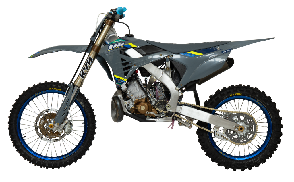 The high-end specification of all TM Racing machines is well-versed and this model year is no exception. The specification list for a ‘production machine’ is vast and features numerous high-quality components throughout. We have have several small changes and revisions to further enhance the chassis that was already designed to improve handling, weight balance, overall machine weight (reduced), rider ergonomics and the visual look. All variants chassis’ and sub-frames will once again be constructed using aluminium, with each engine ‘capacity’ / variant having a chassis unique to that engine displacement. This ‘tailoring’ of the chassis to engine allows TM Racing to design and build each machine for minimal weight, compactness, and better handling characteristics with mass centralisation specific to each model whether 2-stroke or 4-stroke. All chassis are constructed using the latest design elements that reduce overall chassis weight whilst maintaining maximum strength, matched to new revisions in chassis geometry / triple clamp angles that are specifically tailored to each model once again, allowing the best in handling characteristics for each model in the range. On all models, the now standard fitment KYB 48mm twin chamber fork, will continue to adopt the latest generation of internal friction reduction ‘coatings’ with some new internal settings to create a ‘softer’ feel for greater rider comfort and shock absorbtion. These latest generation forks are designed to give improved response for faster changes to the terrain, all still controlled by the more favourable spring and oil set-up which is still proving to give greater reliability and more consistent performance. The TM Racing shock absorber, made in house by the TM racing technicians, has seen some large internal changes over the last 2 years and will still adopt this latest ‘seal’ system designed to reduce friction and increase shock performance, also featuringwill be a brace of internal changes to increase smoothness, comfort and aid tracion. Combined with the latest swing-arms, revised linkage components and spindle diameters to limit and ‘control’ flex, the shock allows for a more progressive feel, giving improved track stability and maximising traction. The chassis and suspension components work together to achieve incredible handling characteristics on a multitude of surfaces, allowing for greater stability in all conditions, increasing traction and inspiring greater confidence to reduce lap-times. The aesthetic look of the machines will remain as per, where the latest chassis generation is not only ‘form’ but ‘function’, reducing the width of the bike reduced by 3cm to create a slimmer machine with better rider ergonomics and more freedom of movement. The current appearance of the latest generation model range is still one of the most striking to date, a mix of angles and curves that blend seamlessly into each other from front to rear. Beautiful, yet aggressive in its shaping, the body panels will feature a new decal scheme incorporating some brighter colour accents giving a more striking visual appearance.