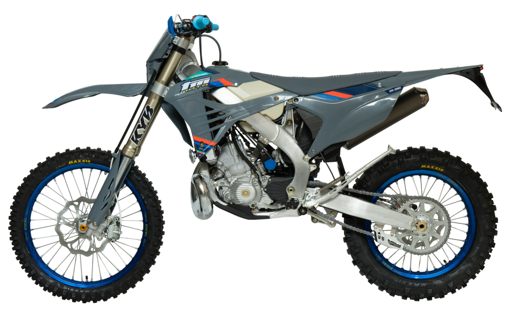 The high-end specification of all TM Racing machines is well-versed and this model year is no exception. The specification list for a ‘production machine’ is vast and features numerous high-quality components throughout. We have have several small changes and revisions to further enhance the chassis that was already designed to improve handling, weight balance, overall machine weight (reduced), rider ergonomics and the visual look. All variants chassis’ and sub-frames will once again be constructed using aluminium, with each engine ‘capacity’ / variant having a chassis unique to that engine displacement. This ‘tailoring’ of the chassis to engine allows TM Racing to design and build each machine for minimal weight, compactness, and better handling characteristics with mass centralisation specific to each model whether 2-stroke or 4-stroke. All chassis are constructed using the latest design elements that reduce overall chassis weight whilst maintaining maximum strength, matched to new revisions in chassis geometry / triple clamp angles that are specifically tailored to each model once again, allowing the best in handling characteristics for each model in the range. On all models, the now standard fitment KYB 48mm twin chamber fork, will continue to adopt the latest generation of internal friction reduction ‘coatings’ with some new internal settings to create a ‘softer’ feel for greater rider comfort and shock absorbtion. These latest generation forks are designed to give improved response for faster changes to the terrain, all still controlled by the more favourable spring and oil set-up which is still proving to give greater reliability and more consistent performance. The TM Racing shock absorber, made in house by the TM racing technicians, has seen some large internal changes over the last 2 years and will still adopt this latest ‘seal’ system designed to reduce friction and increase shock performance, also featuringwill be a brace of internal changes to increase smoothness, comfort and aid tracion. Combined with the latest swing-arms, revised linkage components and spindle diameters to limit and ‘control’ flex, the shock allows for a more progressive feel, giving improved track stability and maximising traction. The chassis and suspension components work together to achieve incredible handling characteristics on a multitude of surfaces, allowing for greater stability in all conditions, increasing traction and inspiring greater confidence to reduce lap-times. The aesthetic look of the machines will remain as per, where the latest chassis generation is not only ‘form’ but ‘function’, reducing the width of the bike reduced by 3cm to create a slimmer machine with better rider ergonomics and more freedom of movement. The current appearance of the latest generation model range is still one of the most striking to date, a mix of angles and curves that blend seamlessly into each other from front to rear. Beautiful, yet aggressive in its shaping, the body panels will feature a new decal scheme incorporating some brighter colour accents giving a more striking visual appearance.
