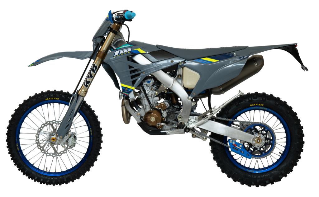The high-end specification of all TM Racing machines is well-versed and this model year is no exception. The specification list for a ‘production machine’ is vast and features numerous high-quality components throughout. We have have several small changes and revisions to further enhance the chassis that was already designed to improve handling, weight balance, overall machine weight (reduced), rider ergonomics and the visual look. All variants chassis’ and sub-frames will once again be constructed using aluminium, with each engine ‘capacity’ / variant having a chassis unique to that engine displacement. This ‘tailoring’ of the chassis to engine allows TM Racing to design and build each machine for minimal weight, compactness, and better handling characteristics with mass centralisation specific to each model whether 2-stroke or 4-stroke. All chassis are constructed using the latest design elements that reduce overall chassis weight whilst maintaining maximum strength, matched to new revisions in chassis geometry / triple clamp angles that are specifically tailored to each model once again, allowing the best in handling characteristics for each model in the range. On all models, the now standard fitment KYB 48mm twin chamber fork, will continue to adopt the latest generation of internal friction reduction ‘coatings’ with some new internal settings to create a ‘softer’ feel for greater rider comfort and shock absorbtion. These latest generation forks are designed to give improved response for faster changes to the terrain, all still controlled by the more favourable spring and oil set-up which is still proving to give greater reliability and more consistent performance. The TM Racing shock absorber, made in house by the TM racing technicians, has seen some large internal changes over the last 2 years and will still adopt this latest ‘seal’ system designed to reduce friction and increase shock performance, also featuringwill be a brace of internal changes to increase smoothness, comfort and aid tracion. Combined with the latest swing-arms, revised linkage components and spindle diameters to limit and ‘control’ flex, the shock allows for a more progressive feel, giving improved track stability and maximising traction. The chassis and suspension components work together to achieve incredible handling characteristics on a multitude of surfaces, allowing for greater stability in all conditions, increasing traction and inspiring greater confidence to reduce lap-times. The aesthetic look of the machines will remain as per, where the latest chassis generation is not only ‘form’ but ‘function’, reducing the width of the bike reduced by 3cm to create a slimmer machine with better rider ergonomics and more freedom of movement. The current appearance of the latest generation model range is still one of the most striking to date, a mix of angles and curves that blend seamlessly into each other from front to rear. Beautiful, yet aggressive in its shaping, the body panels will feature a new decal scheme incorporating some brighter colour accents giving a more striking visual appearance.