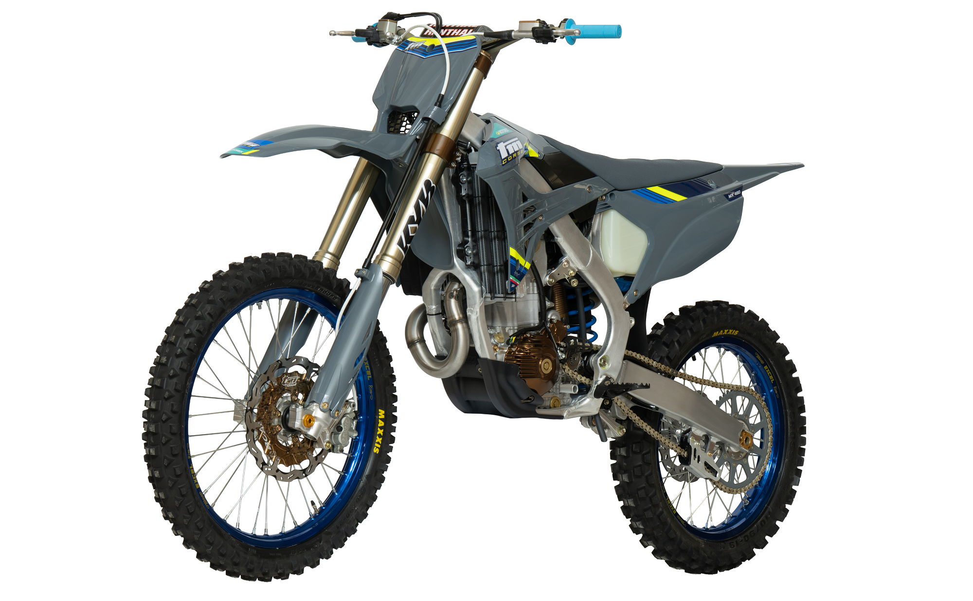 The high-end specification of all TM Racing machines is well-versed and this model year is no exception. The specification list for a ‘production machine’ is vast and features numerous high-quality components throughout. We have have several small changes and revisions to further enhance the chassis that was already designed to improve handling, weight balance, overall machine weight (reduced), rider ergonomics and the visual look. All variants chassis’ and sub-frames will once again be constructed using aluminium, with each engine ‘capacity’ / variant having a chassis unique to that engine displacement. This ‘tailoring’ of the chassis to engine allows TM Racing to design and build each machine for minimal weight, compactness, and better handling characteristics with mass centralisation specific to each model whether 2-stroke or 4-stroke. All chassis are constructed using the latest design elements that reduce overall chassis weight whilst maintaining maximum strength, matched to new revisions in chassis geometry / triple clamp angles that are specifically tailored to each model once again, allowing the best in handling characteristics for each model in the range. On all models, the now standard fitment KYB 48mm twin chamber fork, will continue to adopt the latest generation of internal friction reduction ‘coatings’ with some new internal settings to create a ‘softer’ feel for greater rider comfort and shock absorbtion. These latest generation forks are designed to give improved response for faster changes to the terrain, all still controlled by the more favourable spring and oil set-up which is still proving to give greater reliability and more consistent performance. The TM Racing shock absorber, made in house by the TM racing technicians, has seen some large internal changes over the last 2 years and will still adopt this latest ‘seal’ system designed to reduce friction and increase shock performance, also featuringwill be a brace of internal changes to increase smoothness, comfort and aid tracion. Combined with the latest swing-arms, revised linkage components and spindle diameters to limit and ‘control’ flex, the shock allows for a more progressive feel, giving improved track stability and maximising traction. The chassis and suspension components work together to achieve incredible handling characteristics on a multitude of surfaces, allowing for greater stability in all conditions, increasing traction and inspiring greater confidence to reduce lap-times. The aesthetic look of the machines will remain as per, where the latest chassis generation is not only ‘form’ but ‘function’, reducing the width of the bike reduced by 3cm to create a slimmer machine with better rider ergonomics and more freedom of movement. The current appearance of the latest generation model range is still one of the most striking to date, a mix of angles and curves that blend seamlessly into each other from front to rear. Beautiful, yet aggressive in its shaping, the body panels will feature a new decal scheme incorporating some brighter colour accents giving a more striking visual appearance.